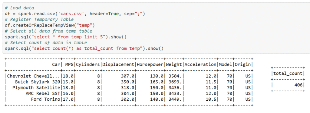 در کد فوق ما به کمک اسپارک، یک فایل CSV را خوانده و روی آن چندین کوئری SQL اجرا کرده ایم. از دید توسعه دهنده، اسپارک محیطی است که به کمک آن می توانیم کارهای پردازش داده را روی هر حجمی از دیتا انجام بدهیم و وظیفه اجرای این کدها روی یک کلاستر از ورکرها و نودهای محاسباتی بر عهده اسپارک است.
