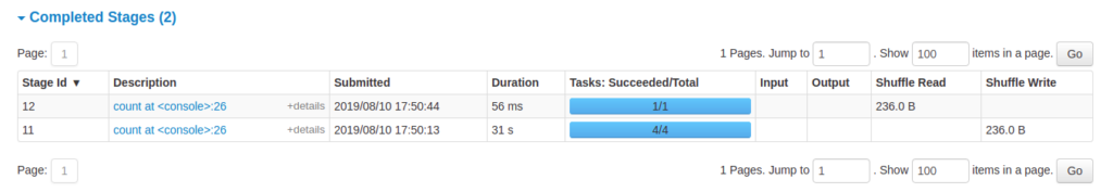 تب Stages یک صفحه خلاصه از وضعیت تمام stageهای تمام jobهای برنامه Spark نشان میدهد.