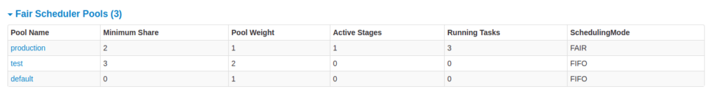 در حالت Fair scheduling، جدولی از ویژگیهای poolها نمایش داده میشود.