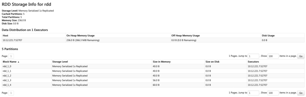 با کلیک روی نام RDD میتوانید توزیع داده روی کلستر را ببینید.